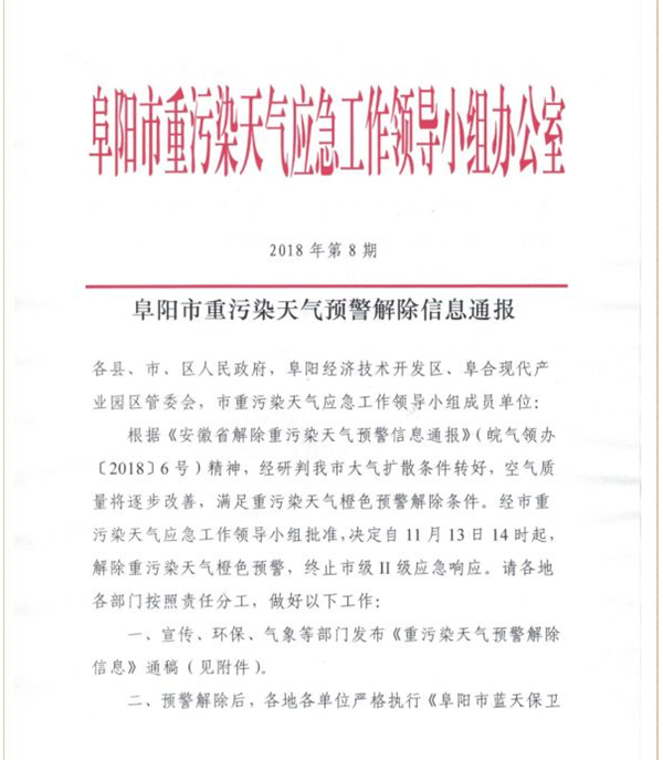 根据《安徽省解除重污染天气预警信息通报》(皖气领办〔2018〕6号)精神,经研判我市大气扩散条件转好,空气质量将逐步改善,满足重污染天气橙色预警解除条件。经市重污染天气应急